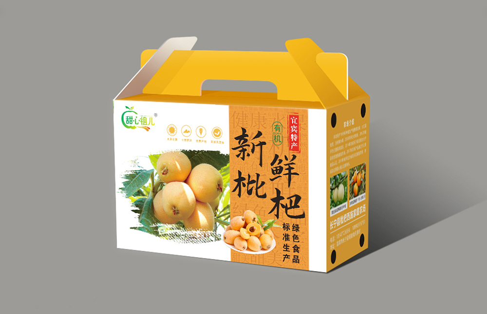 設計理念:本款包裝盒主要為宜賓某農產品公司打造的一款水果品牌包裝,該公司主要種植有:黃金梨、沃柑、枇杷等水果。此次是定制應季水果枇杷包裝,包裝盒顏色以枇杷的橘黃色為主色調,包裝正面以枇杷實物圖作為宣傳形象,體現(xiàn)出“五星級大枇杷”的果肉柔軟多汁,風味鮮美。包裝側邊以公司發(fā)展歷程、產品展示及聯(lián)系方式等信息介紹。