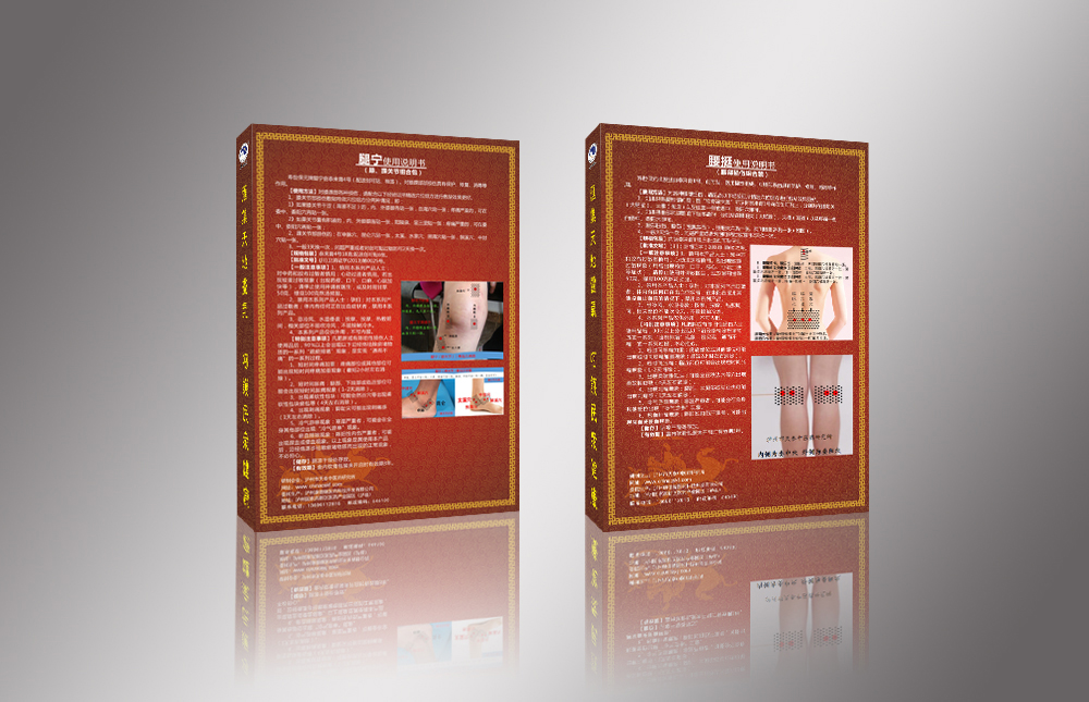 設計理念:本款膏藥貼包裝設計主要是要體現(xiàn)出產(chǎn)品的療效和使用方法,包裝盒正面用一幅人體經(jīng)絡圖片說明人體穴位,讓購買者使用起來方便易懂,并說明膏藥所貼位置;包裝盒背面是產(chǎn)品的使用說明,分別說明了膏藥成分、適用范圍、注意事項、警示及提示性說明、批準文號、規(guī)格包裝等事項。