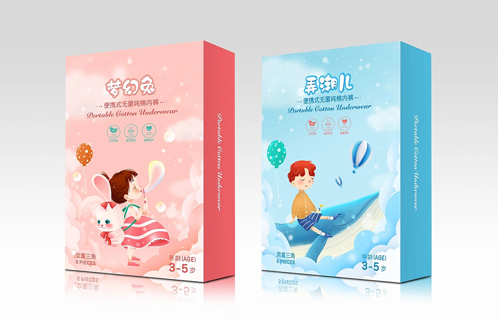 設(shè)計(jì)理念:本款包裝是兒童內(nèi)褲外包裝,包裝盒封面設(shè)計(jì)大膽的采用了卡通形象繪畫(huà)形式,其設(shè)計(jì)以夸張、提煉的手法再現(xiàn)原型,形象即可以滑稽、可愛(ài),也可以嚴(yán)肅、莊重。外包裝上的簡(jiǎn)潔、逗趣的卡通形象會(huì)激發(fā)兒童對(duì)產(chǎn)品的興趣。很多企業(yè)也關(guān)注到消費(fèi)者群體年輕化的發(fā)展趨勢(shì),故此希望借助產(chǎn)品包裝上的卡通形象來(lái)吸引消費(fèi)者,打造自己獨(dú)特的品牌文化,以個(gè)性的包裝定制進(jìn)一步擴(kuò)大產(chǎn)品的市場(chǎng)份額。